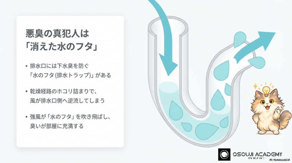 - 臭いの原因:「排水口の水のフタ」が消えていること