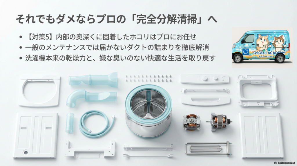 「何をやってもダメ、もう何年も使っている」という場合は、手のかかる乾燥ダクトの奥深くにホコリが固着している可能性があります。メーカーの点検や、専門業者による分解清掃を検討しましょう
