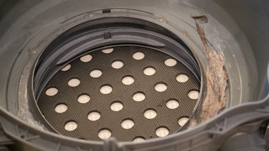 脱水受けカバー内部に埃が溜まり、洗濯機を動かし続けると、脱水受けカバーに穴が開きます。